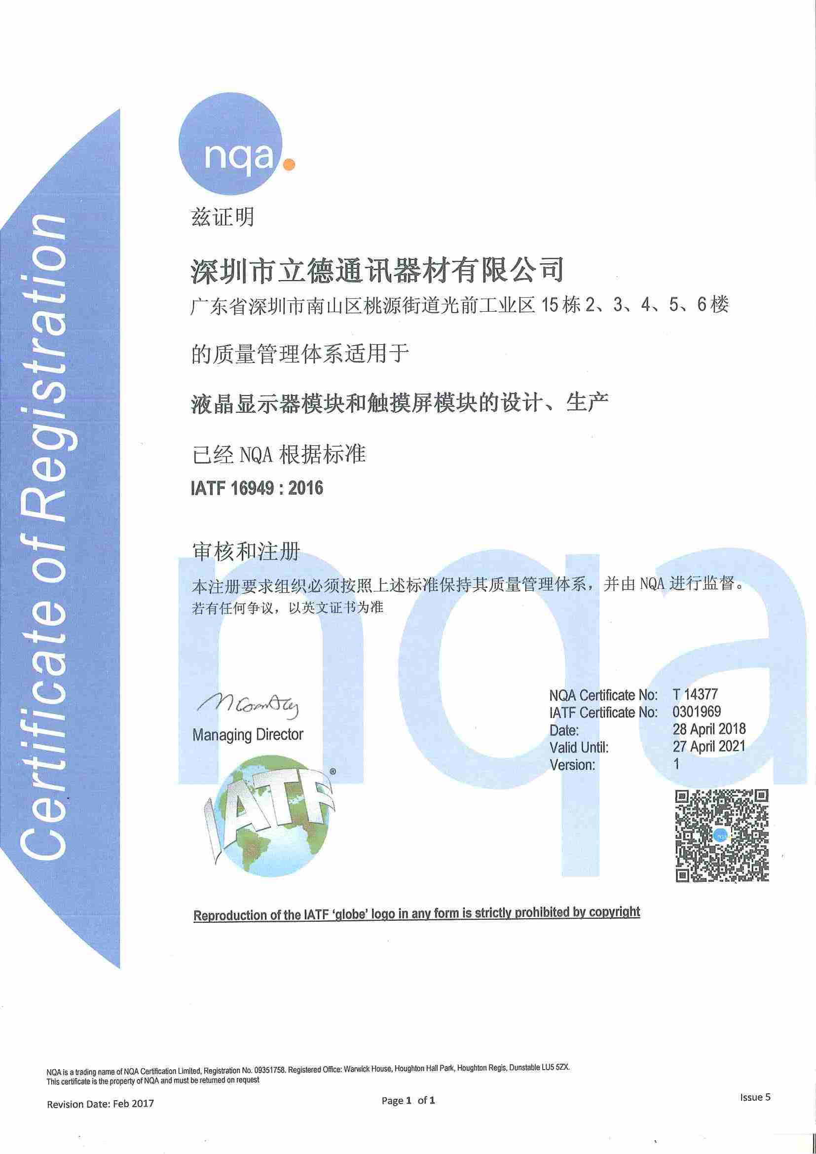 在公司領導及全體員工共同努力下,我司順利通過了IATF16949:2016質量體系認證。這標志著我司的產品榮獲了進入汽車市場領域的綠色通行證,為公司積極開拓車載產品奠定了堅實的基礎。
